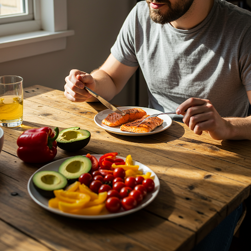 식단은 가능한 가공식품을 줄이고, 복합 탄수화물·불포화 지방·고단백질 중심으로 구성하세요.